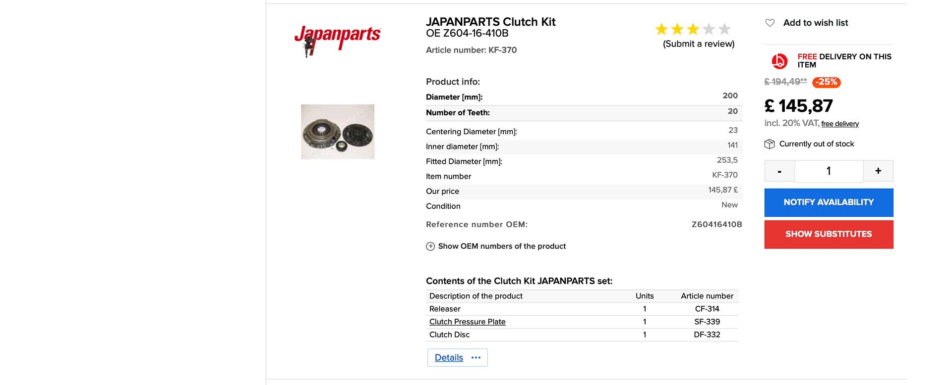 A list of alternatives is displayed if you search for parts by the OEM number. An alternative is a product which has similar or identical characteristics. Right after you've entered the OEM number, be sure to compare the characteristics of the alternatives shown in the list. If there are a number of search results you need to choose from, carefully read and compare the characteristics of the alternative products with your original product, or contact customer service for help. If the spare part you need is out of stock, use the "Show substitutes" button. You'll see a list of products with similar or identical characteristics, but from other brands, and possibly in different price categories.